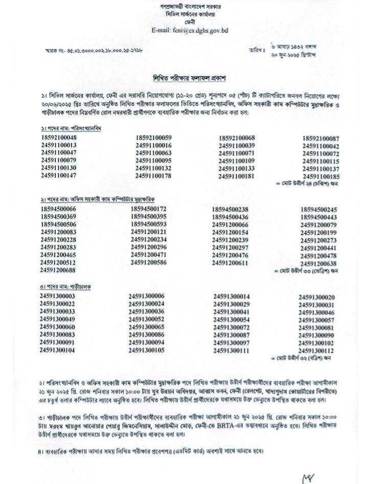 সিভিল সার্জন অফিস ফেনী পরীক্ষার রেজাল্ট ২০২৫